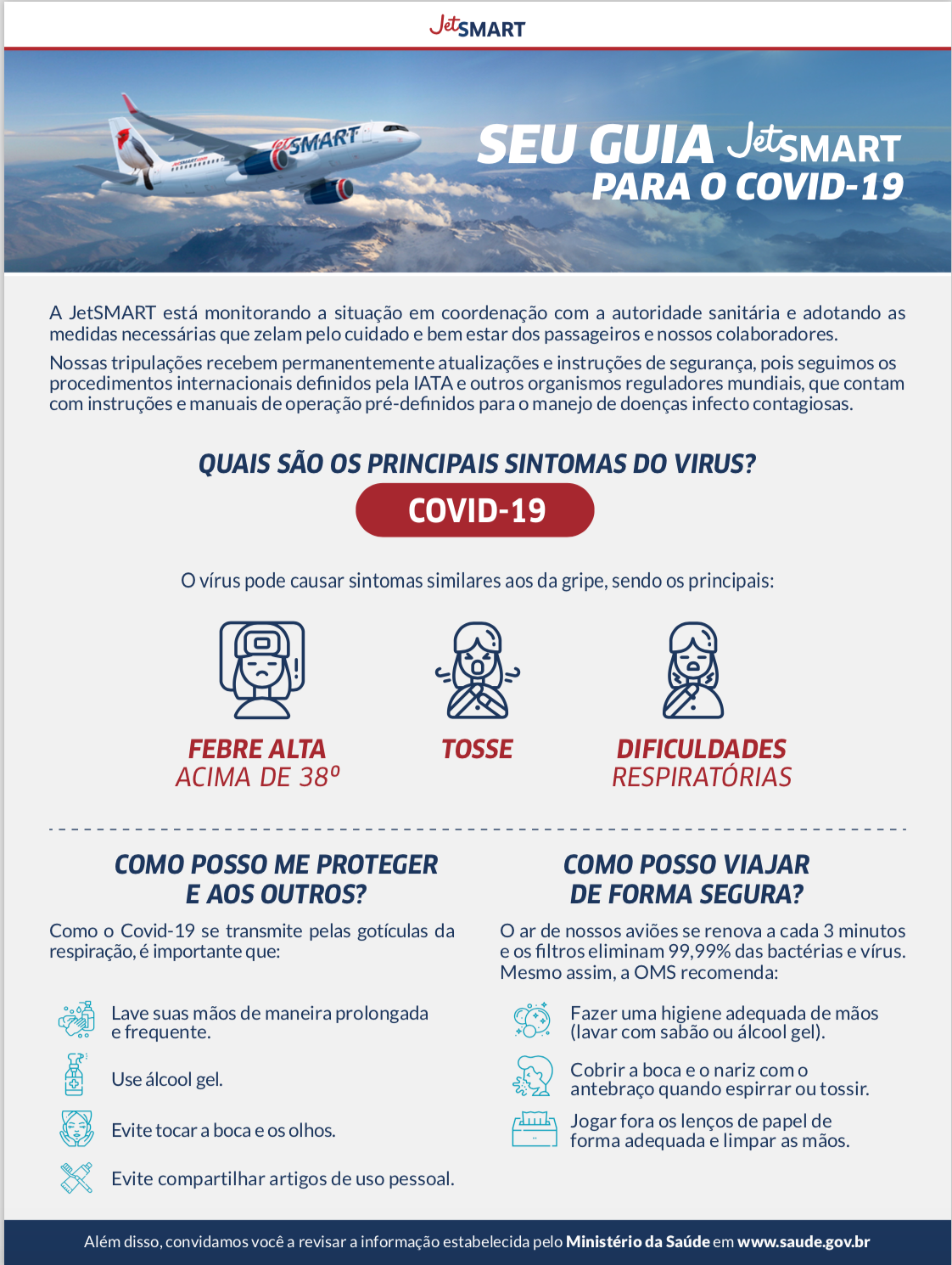 No JetSMART nos preocupamos com o bem-estar de nossos passageiros e tripulantes. É por isso que seguimos procedimentos de higiene de acordo com os regulamentos da IATA, em conjunto com as autoridades de saúde de cada país e a Organização Mundial de Saúde (OMS).